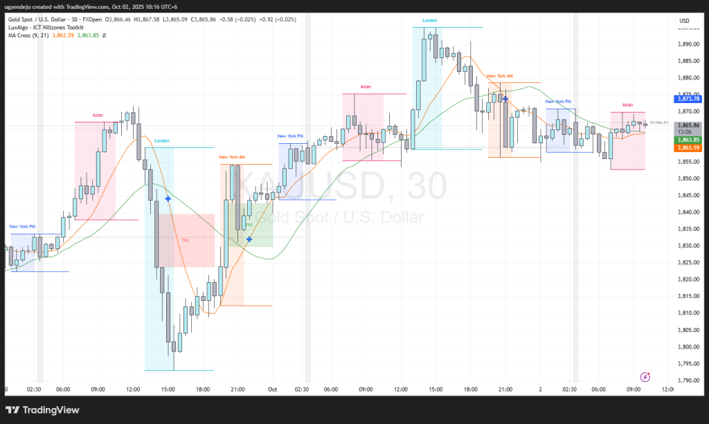 - NY PM created a small FVG (Fair Value Gap) around $3,870–$3,860.
