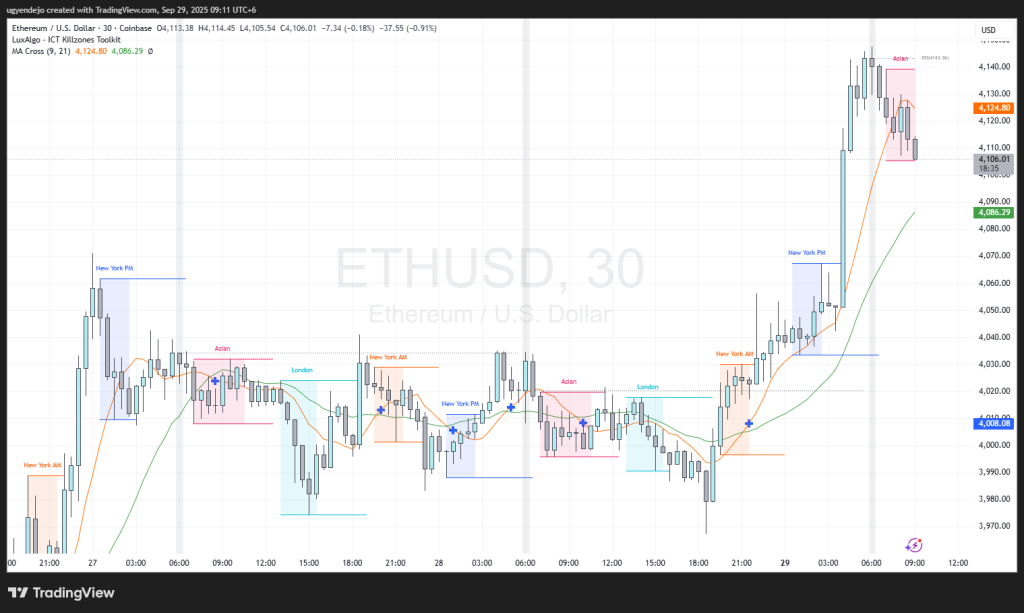 - Between Sep 27–28, price ranged sideways (Asian, London, NY sessions overlapped with small sweeps).