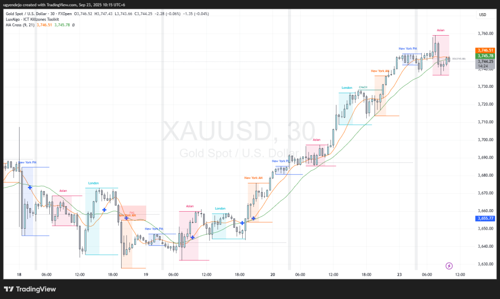 The market has been printing higher highs & higher lows, riding the EMA cross bullish momentum. Current price is consolidating inside the Asian session high ($3,747). Liquidity sits above at $3,755–$3,760, which could be the next target.
